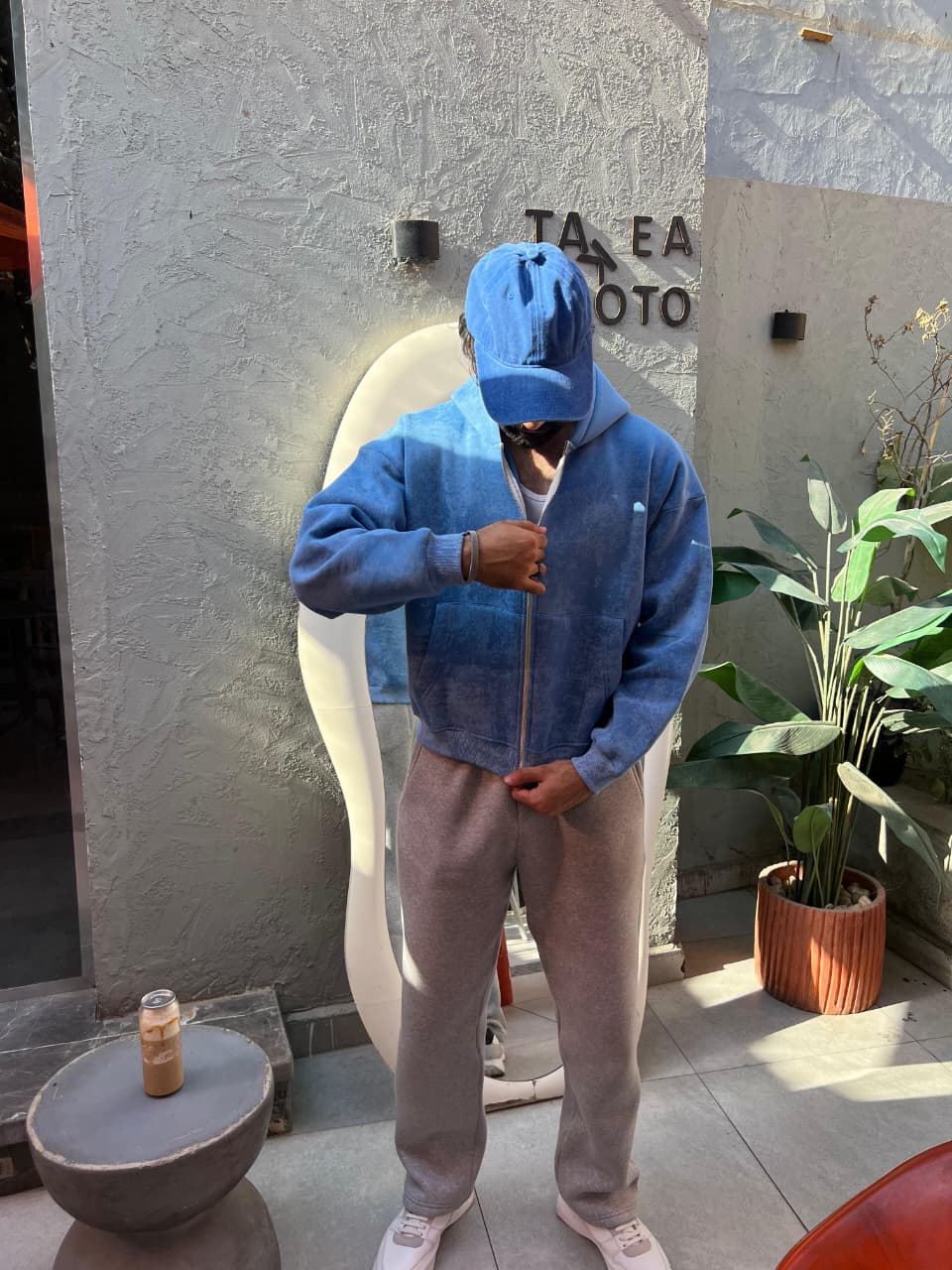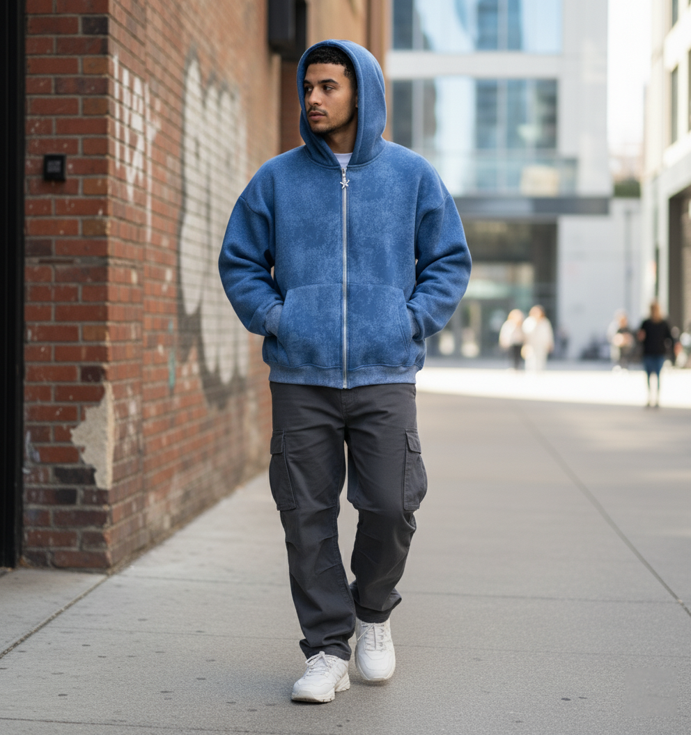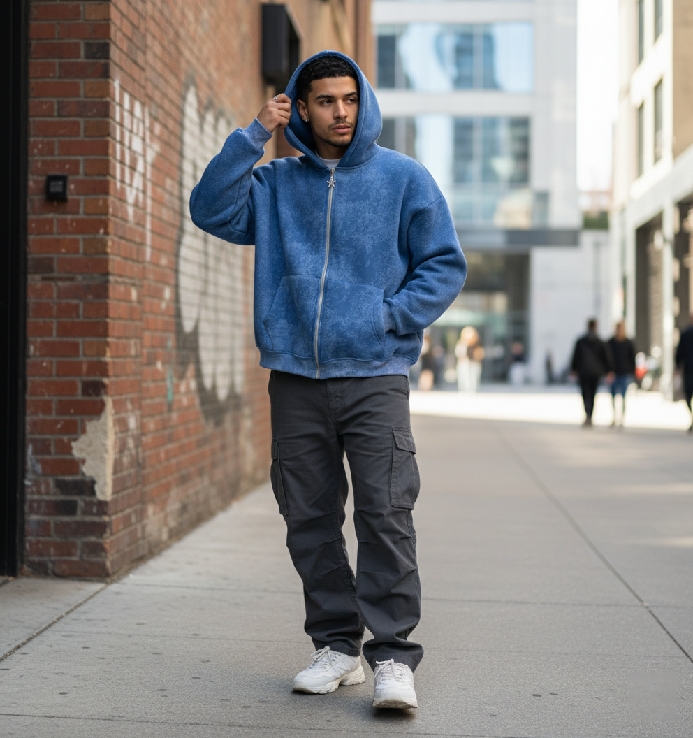 The washed-blue finish gives it that unique cloud-dyed look, making every piece slightly different — your hoodie, your vibe. The front zip, double-layered hood, and kangaroo pockets add extra functionality, while the durable stitching ensures it lasts season after season.
